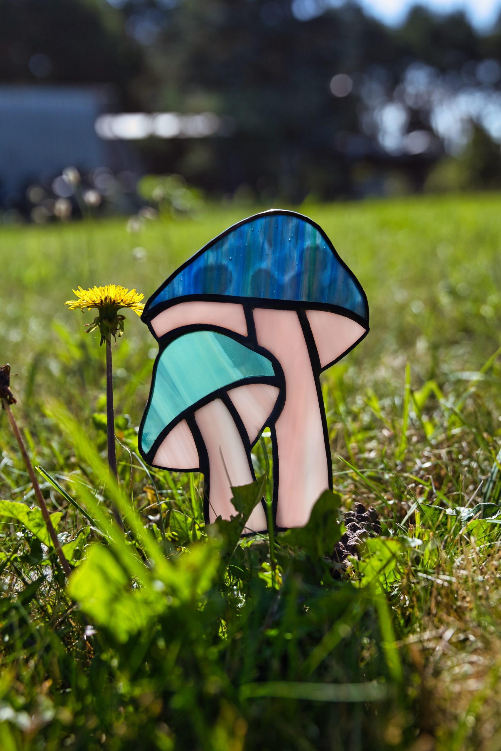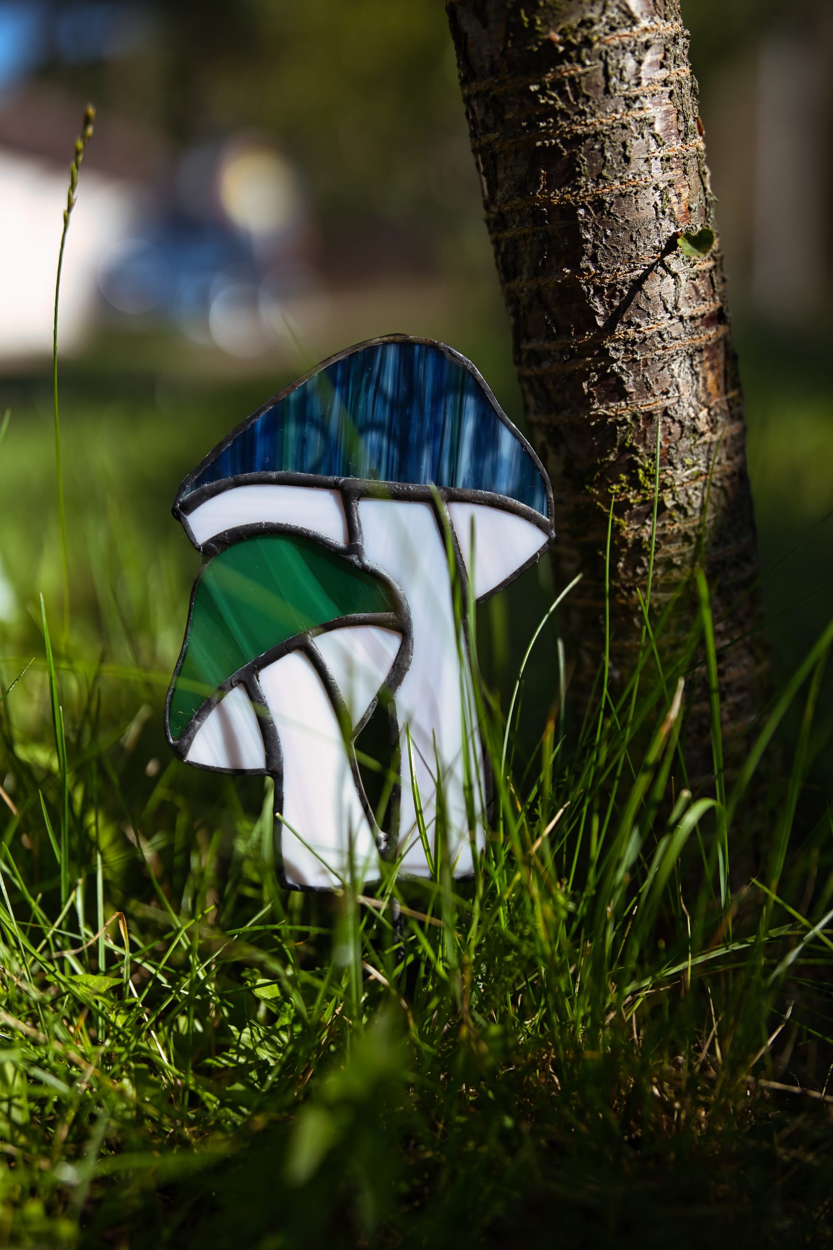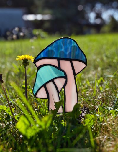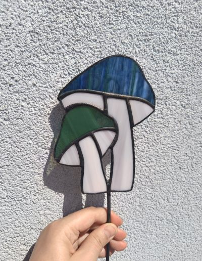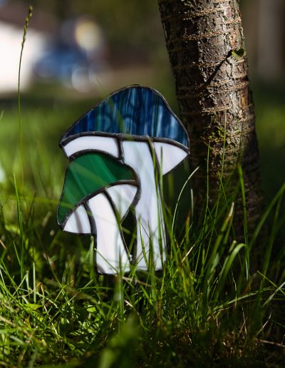 Kapelusz większego grzybka został wykonany z strukturalnego, granatowego szkła.